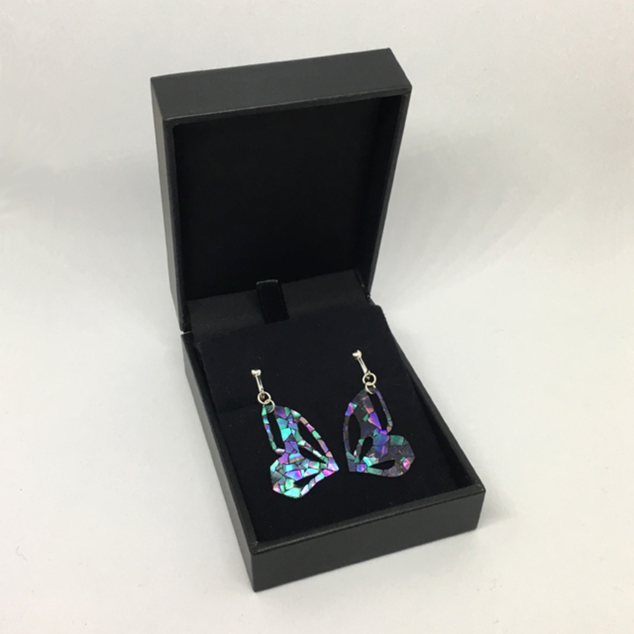 螺鈿が光に当たるとひらひらと美しく舞うアゲハチョウ蝶のように目を引くデザインのイヤリング、追立睦さん作「Mutsumi oitate うるしのしごと」ブランドの商品です。